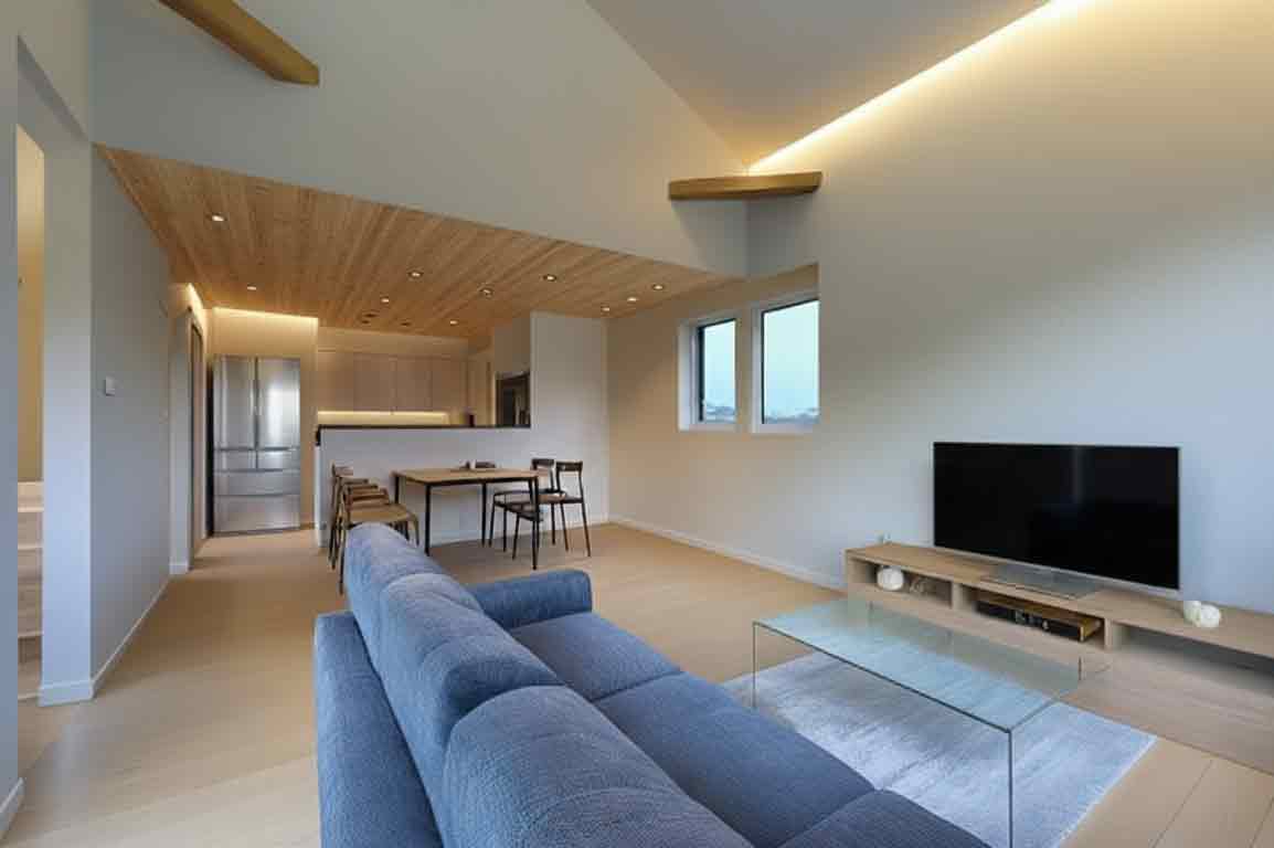 北欧カフェスタイルのリビングダイニング。木目の天井と間接照明が柔らかく空間を包み、開放感ある勾配天井が心地よい雰囲気を演出しています。