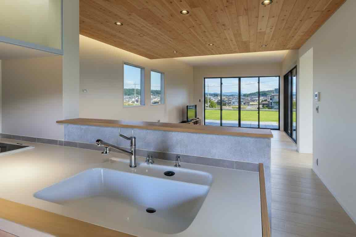 キッチンからリビングを見渡せる開放的な設計。木目の天井と間接照明があたたかみを演出し、奥にはタイルデッキのテラスが続く心地よい空間です。