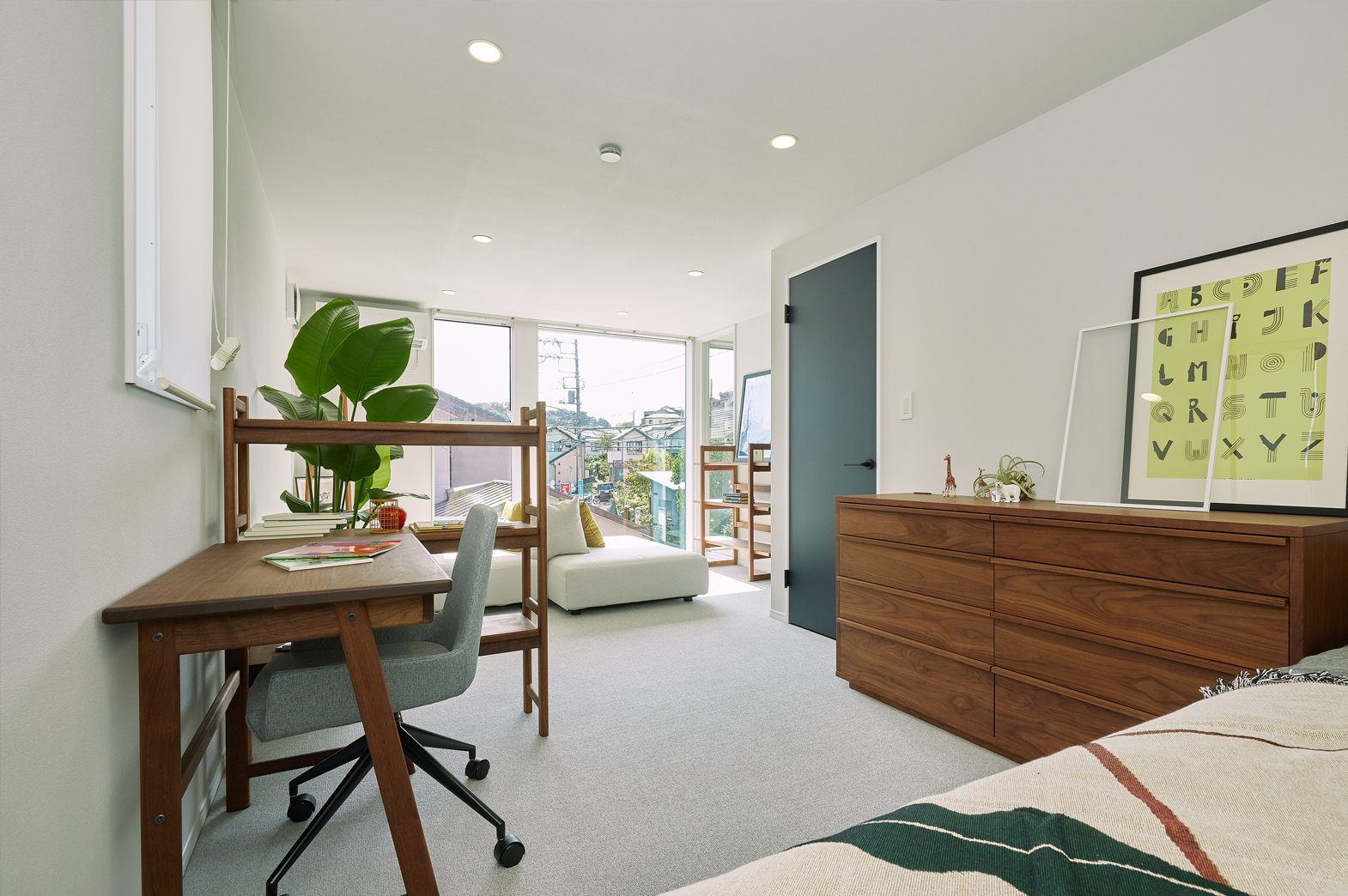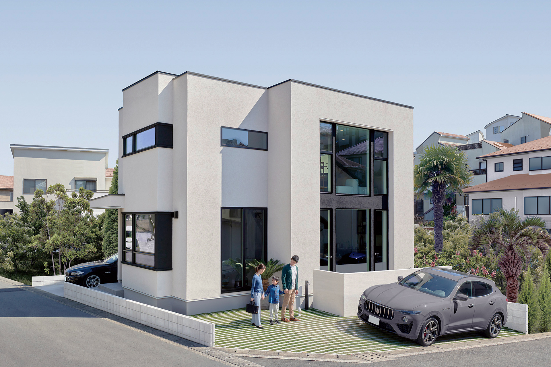 白と黒でコントラストをつけたシンプルな外壁に、パッと目を引く大きな開口窓で、