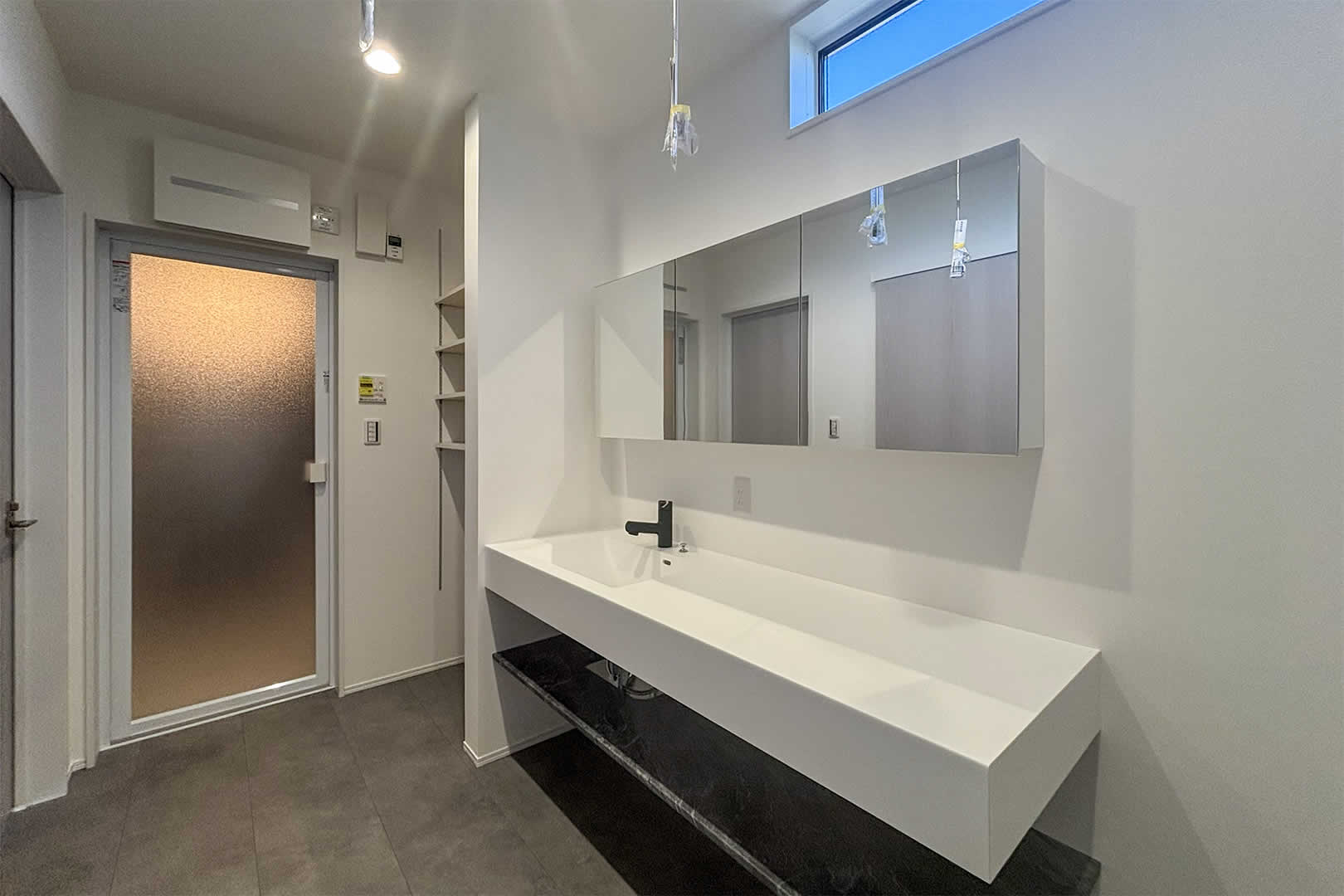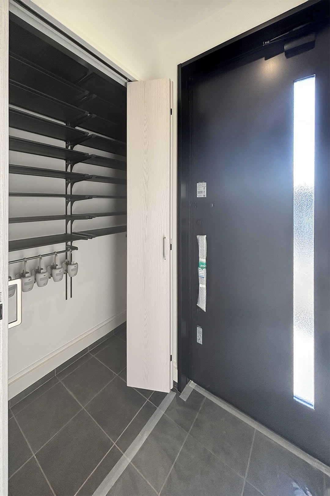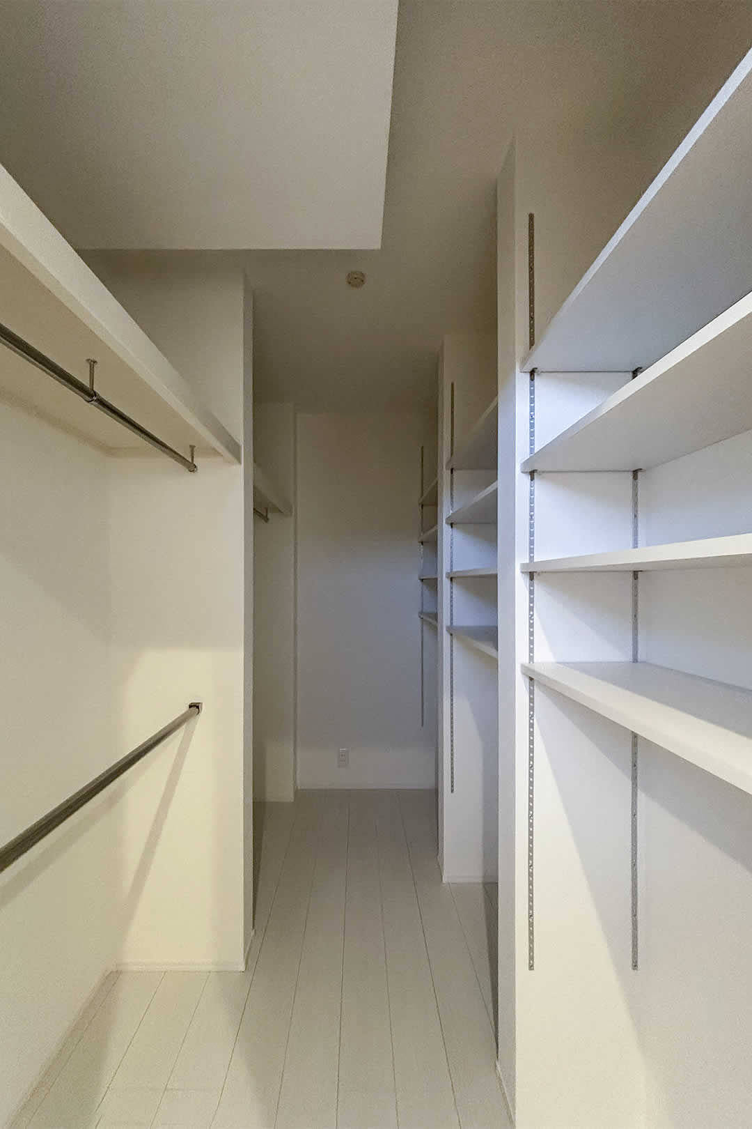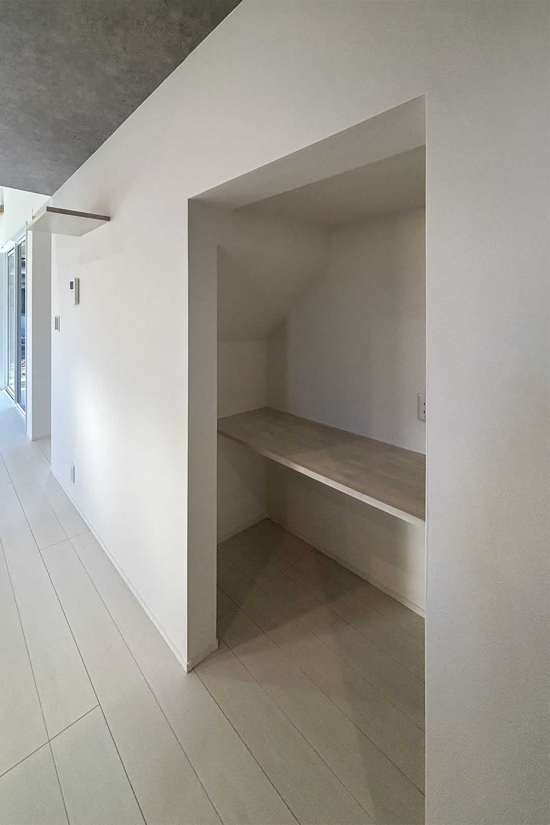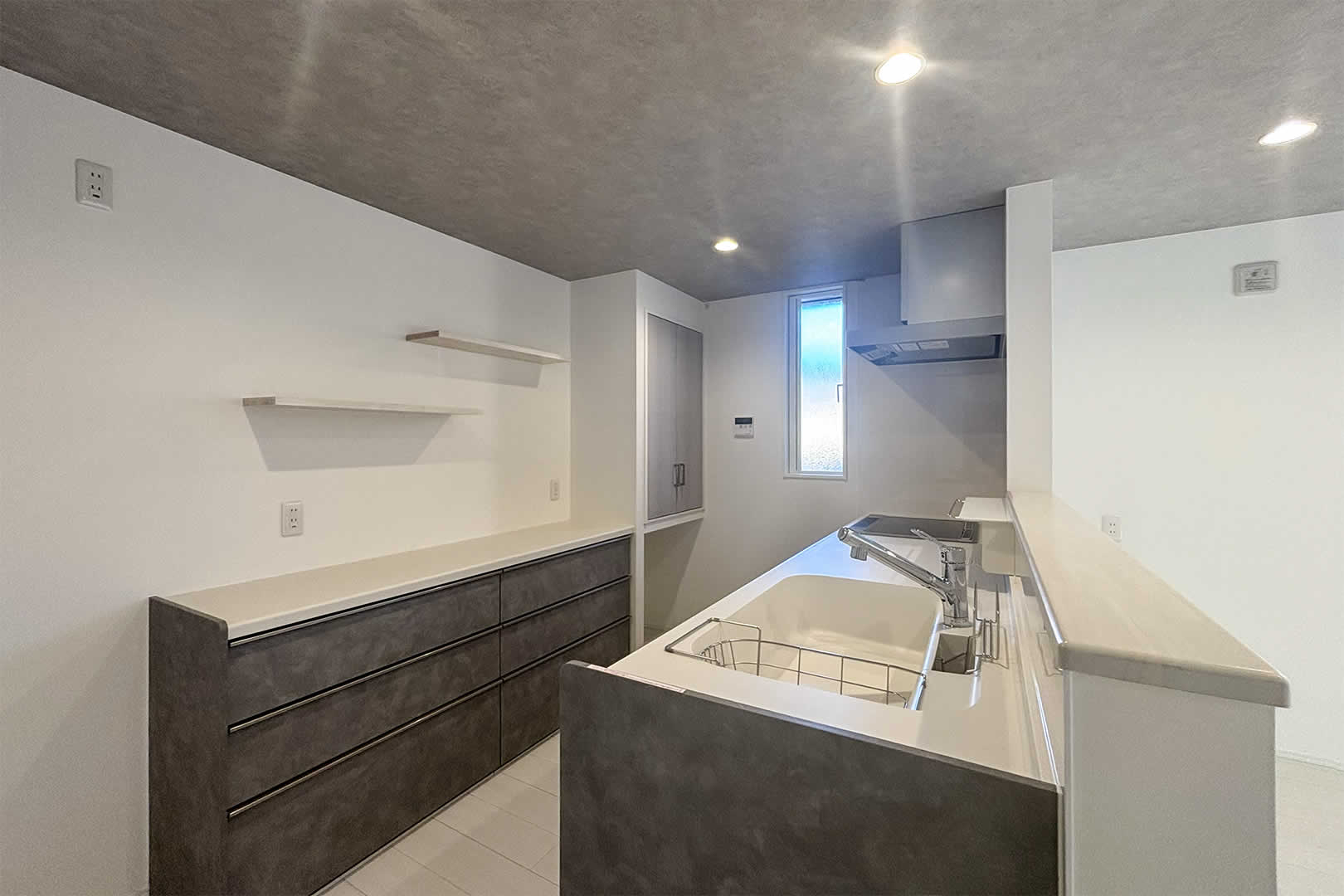 パントリーを確保することで「見えるところに物を置かない」が実現し、グレーの天井と白い床のコントラストが北欧モダンな空間を演出しています。