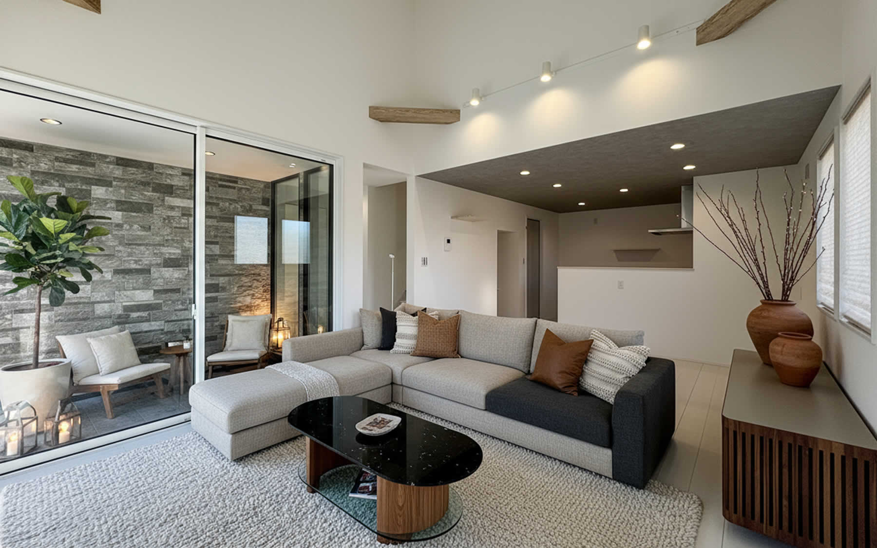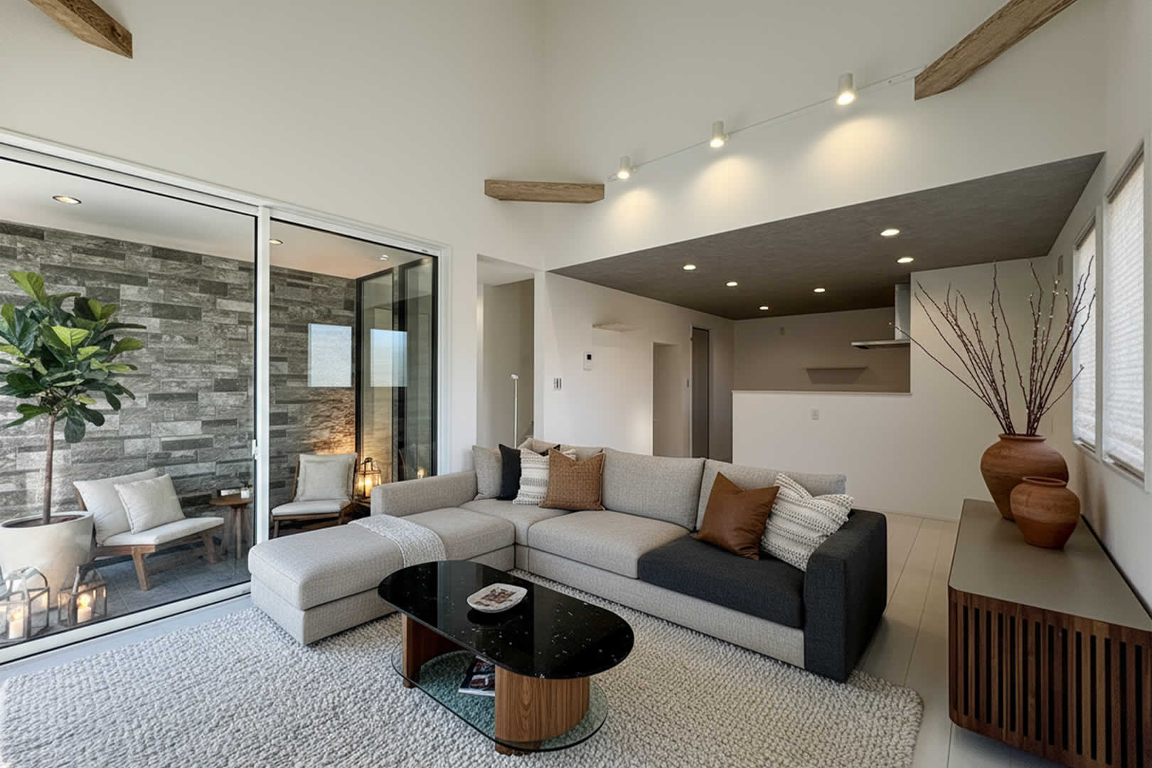北欧カフェテイストのLDK。中庭のテラスと吹き抜けから光が降り注ぐ心休まる空間です。