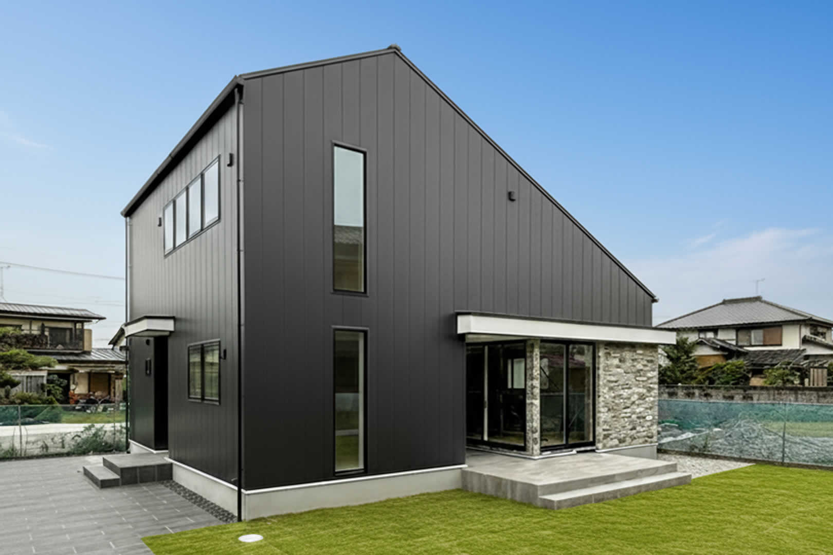 シンプルで洗練されたデザインの外観。中庭と大きな窓が開放感を演出し、自然光をたっぷり取り込む明るい空間が魅力の1.5階建て平屋です。